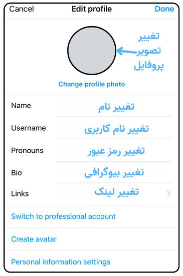 یک حساب کاربری در اینستاگرام، شامل تصویر پروفایل، نام کاربری، اسم شخص، اطلاعات بیوگرافی و لینکها است. در صورتی که قصد دارید هر یک از این موارد را تغییر دهید، باید طبق مراحل زیر عمل کنید: