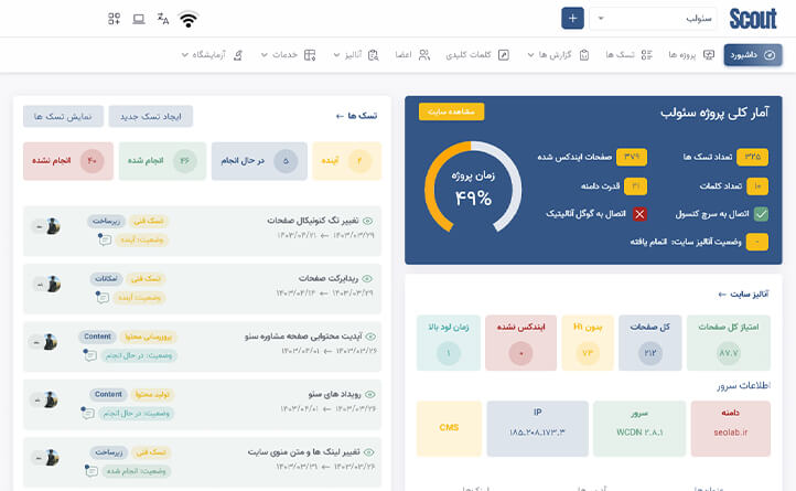 داشبورد پنل سئوی اسکاوت، نمای کلی و جامعی از وضعیت سئوی وبسایت شما ارائه میدهد. با استفاده از این داشبورد، میتوانید به سرعت به مهمترین معیارهای سئو مانند رتبهبندی کلمات کلیدی، ترافیک ارگانیک، بک لینکها و … دسترسی پیدا کنید. همچنین، این داشبورد به شما امکان میدهد تا روند تغییرات سئوی وبسایت خود را در طول زمان مشاهده کنید.
