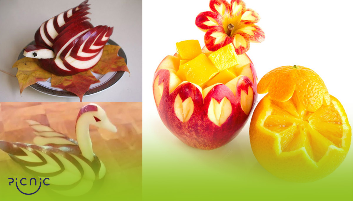 برای تزیین سیب و پرتقال در سفره یلدا، ابتدا یک سیب زرد را بردارید و آن را به لایه‌های نازک به شکل هفت تقسیم کنید. این لایه‌ها را از هم جدا کرده و هر کدام را کمی پایین‌تر از لایه قبلی قرار دهید تا شبیه پرهای یک قو شوند. سپس همین روش را برای یک سیب قرمز تکرار کنید و سیب‌های تزیین‌ شده را بر روی میوه‌های دیگر یا کنار هم قرار دهید.