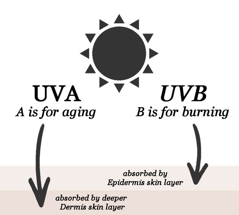 - “A” در UVA مخفف «Aging» یا اشعه پیری و دارای طولموج طولانی است، یعنی به عمق پوست یا همان «درم» نفوذ میکند. این اشعه نه تنها ایجادکننده سرطان است، بلکه نقش مهمی در پیری دارد، زیرا به کلاژنهای عمیق پوست حمله میکند.